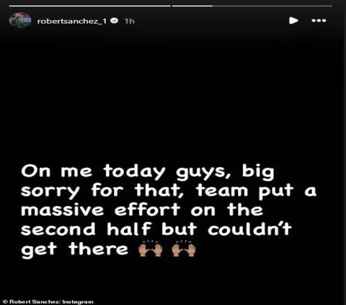 赛后,切尔西门将罗伯特·桑切斯就自己的红牌失误做出了道歉。他在Instagram快拍上发布声明,主动承担责任:“今天怪我,真的很抱歉,球队在下半场拼尽了全力,但还是没能逆转。”