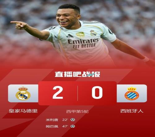 直播吧9月20日宣 北京时间9月20日22时15分,西甲第5轮,皇马坐镇伯纳乌球场迎战西班牙人。上半场,米利唐世界波首开纪录。皇马半场1-0领先西班牙人。下半场,姆巴佩也轰进一粒世界波。最终皇马2-0击败西班牙人,取得联赛4连胜,继续领跑西甲。