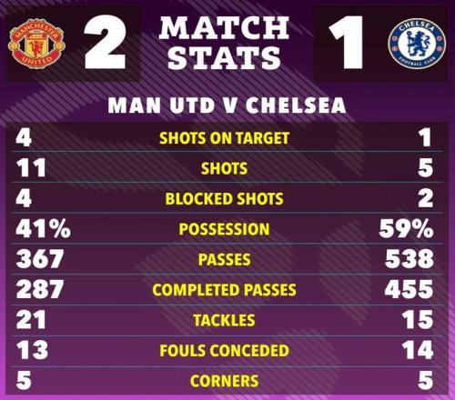 人数均等的情况下,曼联完全处于被动防守态势。不过,他们的防守尚可,切尔西久攻不下。第63分钟,福法纳曾经头球破门,但他越位在先,进球无效。