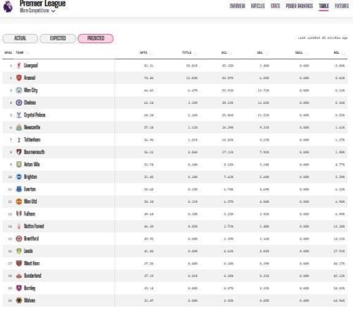 OPTA英超各队夺冠概率:利物浦59.81%居首,阿森纳23.83%位居次席