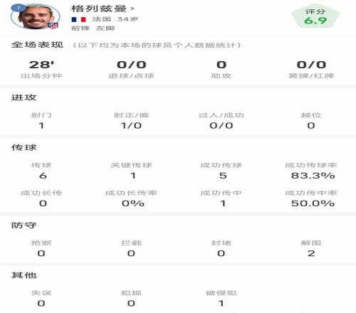 雷速体育9月22日宣 本轮西甲,马竞1-1战平马略卡。马竞前锋格列兹曼此役未能首发,他在第67分钟上场换下拉斯帕多里。 数据显示,格列兹曼本场比赛1次射门,但未能进球。 他有6次传球,其中5次成功,包括1次关键传球,1次成功传中。 此外他还贡献了2次解围,被侵犯1次。 统计显示,格列兹曼在西甲已经232天没有进球了,事实上最近30场比赛,他也只进了2球,其中1球是在国王杯中对阵巴萨时打入的,还有1球是世俱杯对博塔弗戈打入的。 |
