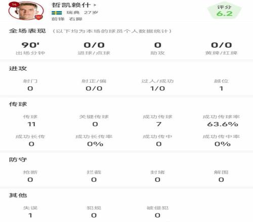 哲凯赖什战曼城数据:0射门,11次传球,获评6.2分