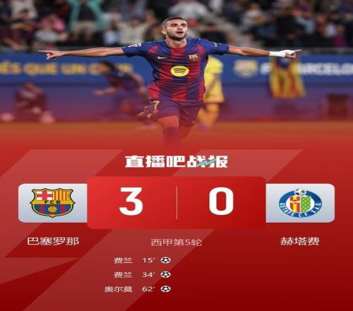 5轮不败!巴萨3-0赫塔费 费兰双响奥尔莫传射 拉什福德替补献助攻