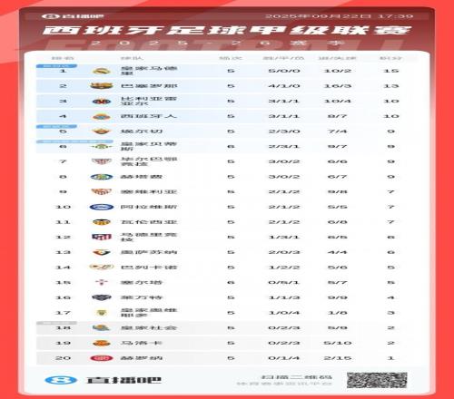 你的主队在哪五大联赛合体积分榜:皇马利物浦5轮全胜领跑