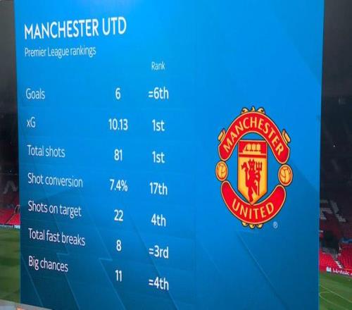 据统计,曼联在本赛季的英超联赛当中展现出的进攻效率非常不理想。 据统计,曼联在本赛季英超联赛的射门次数达到了81次,预期进球值则是10.13个,他们的这两项数据均位列第1。 然而曼联最终取得的联赛进球数只有6个,并列排在第6位。