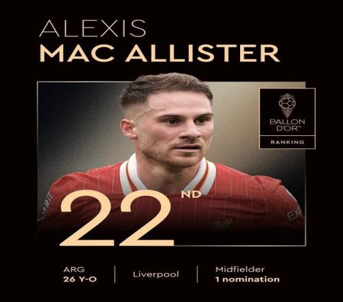 直播吧9月23日宣 2025年金球奖排名陆续公布,利物浦中场麦卡利斯特获得第22名,生涯首次入选。