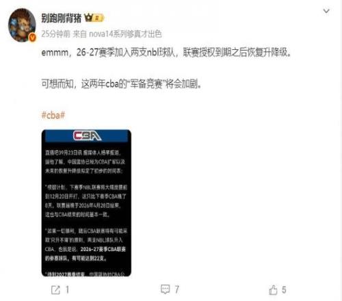 直播吧9月23日讯 今天,媒体人@别跑刚背猪 在社媒上谈到了cba恢复升降级相关的流言。 @别跑刚背猪 在个人微博上写道:“emmm,26-27赛季加入两支NBL球队,联赛授权到期之后恢复升降级。 “可想而知,这两年cba的‘军备竞赛’将会加剧。” 相关新闻阅读: 媒体人:如顺利26-27赛季两支NBL球队升入CBA 27年后将恢复升降级 |