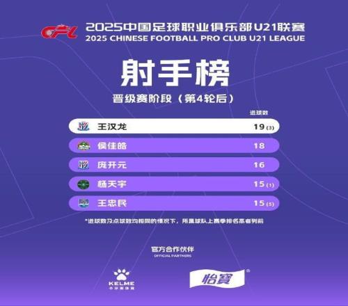 射手榜方面,上海申花U21球员王汉龙以19粒进球排名第一,浙江队U21球员侯佳皓以18球排名第二。