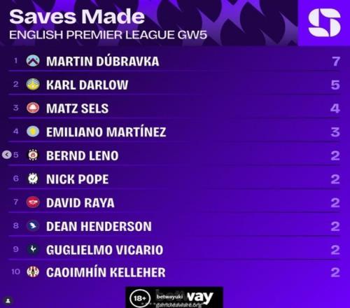 英超第5轮扑救榜:杜布拉夫卡7次最多,卡尔达尔洛5次第二