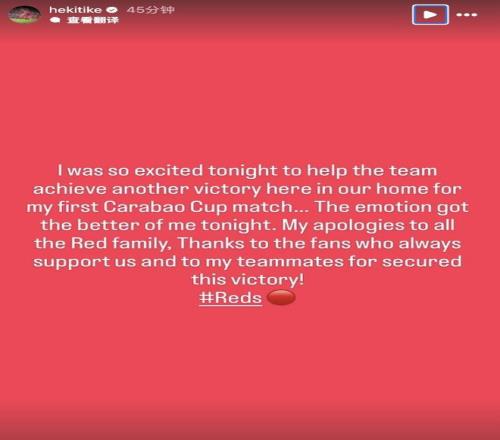 在与南安普顿的英联杯比赛中因脱衣庆祝染红后,利物浦前锋埃基蒂克在社交媒体发文道歉。 与南安普顿一役,替补登场的埃基蒂克在比赛第85分钟破门,进球后脱衣庆祝,领到第二张黄牌,两黄变一红被罚下,这位利物浦前锋将因停赛缺席本周末英超比赛。 斯洛特在赛后新闻发布会上也直言埃基蒂克的行为“有点愚蠢”。 埃基蒂克随后在社交媒体发文道歉,他写道:“我今晚非常激动,能在主场帮助球队在我参加的第一场英联杯比赛中再获一场胜利……今晚的情绪让我有些失控,向所有红军家人道歉,感谢一直支持我们的球迷,也感谢我的队友们帮助我们赢得这场胜利!” 【上咪咕独家看英超】 |