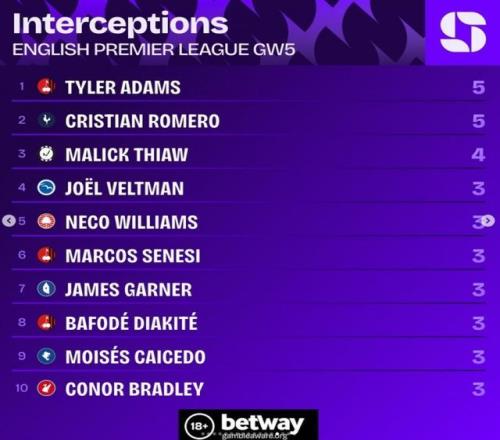英超第5轮拦截榜:泰勒亚当斯、罗梅罗5次最多
