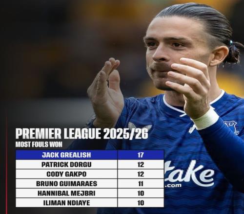英媒:格拉利什是本赛季英超犯规次数最多的球员,远超第二名