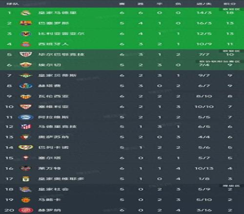 西甲第6轮结束了5场比赛,最新积分榜如下!