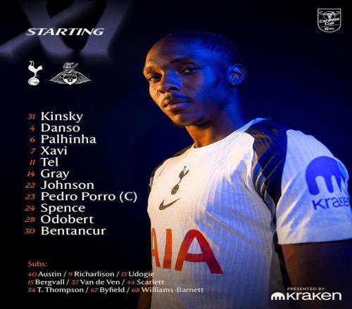 北京时间9月25日2:45,英联杯第三轮,托特纳姆热刺坐镇主场迎战英甲球队唐卡斯特,本场主裁判为马德利,赛前双方首发出炉。 【上咪咕独家看英超】 |
