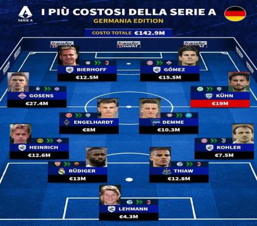 门将:莱曼(430万欧元身价从沙尔克04转会至AC米兰) 后卫:吕迪格(1300万欧元身价从斯图加特转会至罗马)、马利克-佳夫(1280万欧元身价从沙尔克04转会至AC米兰)、海因里希(1260万欧元身价从多特蒙德转会至佛罗伦萨)、于尔根-科勒(750万欧元身价从拜仁慕尼黑转会至尤文图斯)、戈森斯(2740万欧元身价从亚特兰大转会至国际米兰) 中场:德姆(1030万欧元身价从RB莱比锡转会至那不勒斯)、恩格尔哈特(800万欧元身价从杜塞尔多夫转会至科莫)、比埃尔霍夫(1250万欧元身价从乌迪内斯转会至AC米兰) 前锋:尼古拉斯-库恩(1900万欧元身价从凯尔特人转会至科莫)、马里奥-戈麦斯(1550万欧元身价从拜仁慕尼黑转会至佛罗伦萨) 【上咪咕独家看英超】 |