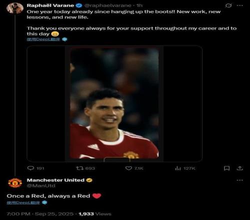 曼联官方回复瓦拉内纪念退役一周年社媒:一日红魔,终生红魔