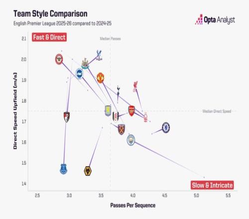 每个赛季,足球世界总会涌现出新的战术潮流。 尽管 2025 - 26 赛季英超联赛仅仅进行了五轮角逐,但一些新颖(亦或是复古)的战术理念已然初露端倪。 其中,一个愈发明显的趋势是——英超球队的打法正朝着更加直接的方向发展。当然,这种趋势在大多数球队身上体现得较为显著…… 当我们聚焦自上赛季以来连续征战英超的 17 支球队时,会发现一些有趣的数据变化。 其中,有 11 支球队在平均每次进攻序列中的传球次数相较于 2024 - 25 赛季有所减少。 与此同时,同样有 11 支球队加快了向前场推进的速度,而且在这 11 支球队中,有 7 支球队同时达成了传球次数减少与推进速度加快这两项指标。 这意味着,这些球队在本赛季能够以更少的传球次数,更快地将球推进到前场区域。 以曼城为例,这支球队的变化格外引人注目。上赛季,曼城每次进攻序列的平均传球次数为 5.12 次,而本赛季这一数据降至 3.97 次。 与此同时,他们前场推进的平均速度从 1.43 米/秒提升至 1.61 米/秒。如此显著的变化,无疑反映出曼城战术风格的调整。 然而,并非所有球队都选择采用更直接的战术打法。诺丁汉森林就是一个典型的反例。 在努诺桑托和现任主帅波斯特科格鲁的先后执教下,诺丁汉森林的战术风格发生了较大转变。他们将每次进攻序列的平均传球次数从联赛最低的 2.88 次增加到了第二高的 4.2 次。 与此同时,球队的前场推进速度从联赛最快的 2.04 米/秒降至并列第六慢的水平。 从各球队的整体数据来看,布伦特福德以每次进攻序列 2.84 次的平均传球次数,成为本赛季英超最直接的球队,其进攻风格简洁明了,注重快速推进。 而切尔西则以 4.52 次的平均传球次数,成为传球最为复杂的球队,或许更倾向于通过细腻的传切配合来撕开对手防线。 另外,伯恩茅斯、埃弗顿和狼队这三支球队与上赛季相比,明显放慢了比赛节奏,不过最终呈现出的结果却各有不同。 狼队以 1.46 米/秒的推进速度成为联赛推进最慢的球队,同时在积分榜上也排名垫底,进攻效率的低迷或许与他们缓慢的节奏不无关系。 而表现出色的水晶宫则以 2.02 米/秒的推进速度成为进攻推进最快的球队,快速的节奏或许正是他们取得佳绩的关键因素之一。 |