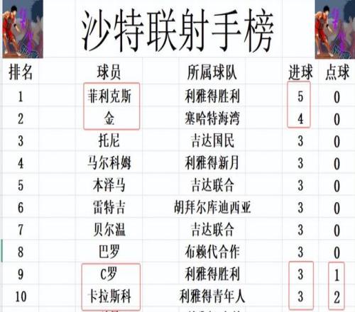 射手榜方面,菲利克斯3轮5球位列榜首,金4球排在第2。巴罗破门,卡拉斯科点射,他们追上C罗,本泽马,雷特吉等人,将前十门槛提高到2球,因此莱昂纳多今天梅开二度,也还是无缘前十。