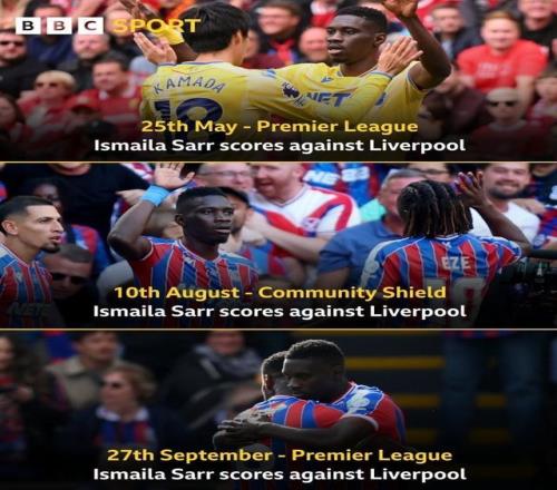 红军苦主,水晶宫前锋萨尔连续3次面对利物浦均破门