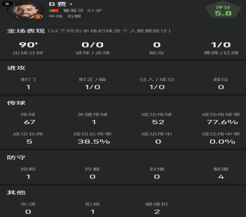 B费全场数据:表现低迷罚丢点球,进球助攻均为0