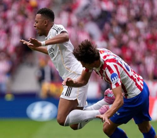 这是第241次同城德比,此前240次交锋,皇马117胜63平60负占据上风。最近3次德比战,结局都是1-1平。本场比赛,贝林厄姆回归首发,维尼修斯、姆巴佩搭档前锋,马竞则是索尔洛特、阿尔瓦雷斯的双前锋组合。 比赛第14分钟,勒诺尔芒为马竞先拔头筹。第25分钟,姆巴佩挺身而出,为皇马扳平比分: