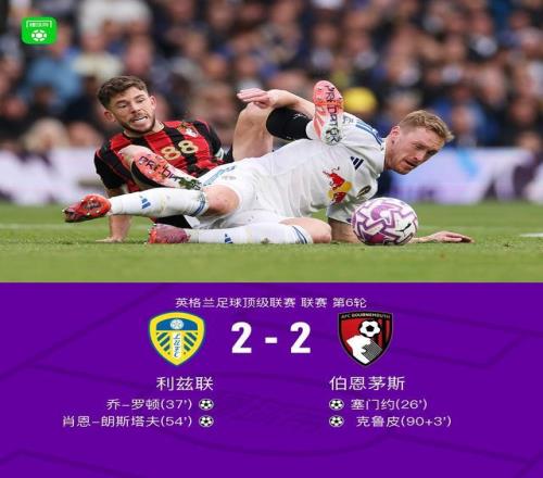 北京时间9月27日,英格兰足球超级联赛第6轮展开较量,利兹联坐镇主场迎战伯恩茅斯。比赛开局阶段,伯恩茅斯率先打破僵局,塞门约接队友传球后冷静施射得手,帮助球队取得领先。随后利兹联迅速做出回应,肖恩-朗斯塔夫精准输送助攻,乔-罗顿抓住机会推射破门,将比分扳平。 易边再战,利兹联持续加强攻势,并由肖恩-朗斯塔夫在一次进攻中突入禁区完成破门,成功反超比分。然而伯恩茅斯并未放弃,比赛临近结束前,塞内西送出关键传球,克鲁皮门前抢点破门,为球队顽强地将比分再度拉平。最终双方以2比2握手言和,各取一分。 关键事件 第26分钟,干净利落!塞门约任意球贴地斩破门,伯恩茅斯1-0领先 上咪咕独家看英超 第37分钟,扳平比分,乔-罗顿头球破门,1-1 上咪咕独家看英超 第54分钟,反超比分!朗斯塔夫凌空抽射死角破门,2-1 上咪咕独家看英超 第90+3分钟,绝平!克鲁皮门前破门,伯恩茅斯2-2利兹联 上咪咕独家看英超