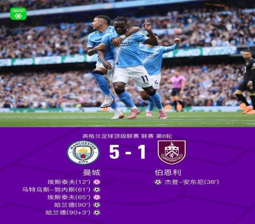 北京时间9月27日英格兰足球顶级联赛 联赛 第6轮,曼城主场对阵伯恩利。上半场多库一条龙后射门被扑,埃斯泰夫自摆乌龙,之后哈特曼传中,杰登-安东尼折射破门扳平。下半场哈兰德头球摆渡,努内斯抽射破门再度领先,之后努内斯传球,埃斯泰夫再度自摆乌龙,比赛尾声多库助攻哈兰德破门,补时阶段埃斯泰夫乌龙助攻,哈兰德单刀破门完成双响。最终曼城5-1战胜伯恩利。 关键事件 第12分钟,多库一条龙后射门被扑,埃斯泰夫自摆乌龙,曼城1-0伯恩利 上咪咕独家看英超 第38分钟,哈特曼传中,杰登-安东尼折射破门,伯恩利1-1曼城 第61分钟,哈兰德头球摆渡,努内斯抽射破门,曼城2-1伯恩利 第65分钟,努内斯传球,埃斯泰夫再度自摆乌龙,曼城3-1伯恩利 第90分钟,多库助攻哈兰德破门,曼城4-1伯恩利 第90+3分钟,埃斯泰夫乌龙助攻,哈兰德单刀破门完成双响,曼城5-1