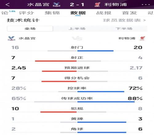 直播吧9月28日宣 在本轮英超,利物浦1-2不敌水晶宫。以下为双方全场数据对比: 水晶宫vs利物浦 射门:16-20 射正:7-4 预期进球:2.45-2.17 得分机会:7-6 控球率:28%-72% 犯规:10-8 黄牌:1-3 角球:2-6 独家看英超就在咪咕 |