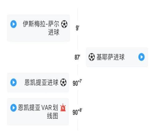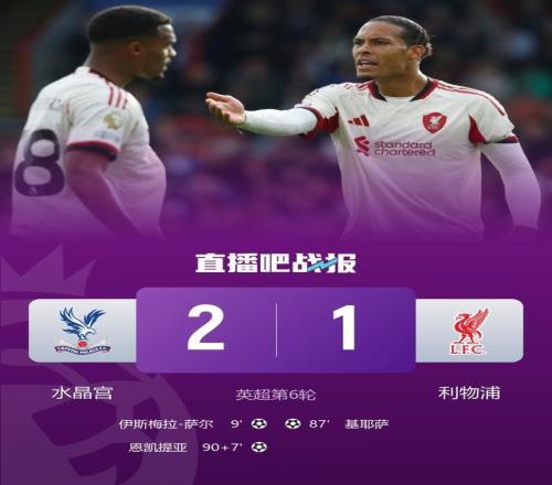 水晶宫2-1利物浦,第87分钟基耶萨进球,第97分钟恩凯提亚进球↓