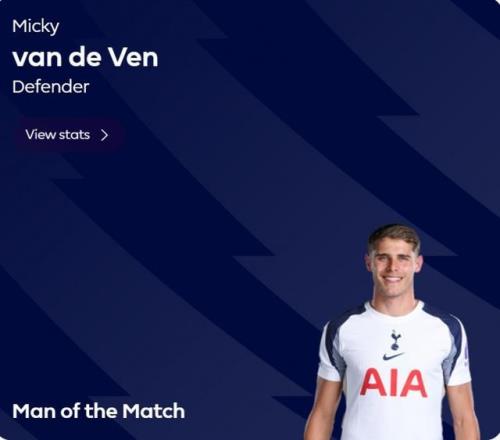 直播吧9月28日宣 英超第6轮比赛,热刺主场1-1战平狼队。 此役范德文为热刺踢满全场,这位中卫当选本场比赛最佳球员。 独家看英超就在咪咕 |