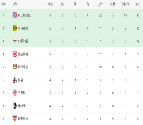 在积分榜上,5连胜的拜仁依然占据榜首位置,拿到了15分。多特蒙德4胜1平,拿到13分,紧追拜仁。前2的差距只有2分,看来本赛季对拜仁来说最强大的竞争对手是多特蒙德,而不是勒沃库森。莱比锡则以12分排名第3。法兰克福赢球之后,总积分达到9分,排名第4。勒沃库森2胜2平1负,拿到8分,排名第5。科隆和圣保利都拿到7个积分,排名第6和第7名。