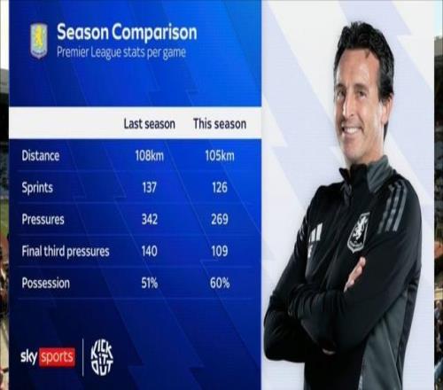 直播吧9月28日宣 本赛季英超,维拉0胜3平2负积3分,位居联赛第18位。日前,《天空体育》统计了维拉本赛季与上赛季的联赛场均数据。 跑动距离:本赛季108公里,上赛季105公里 冲刺次数:本赛季137次,上赛季126次 压迫次数:本赛季342次,上赛季269次 进攻三区压迫次数:本赛季140次,上赛季109次 控球率:本赛季51%,上赛季60% 独家看英超就在咪咕 |