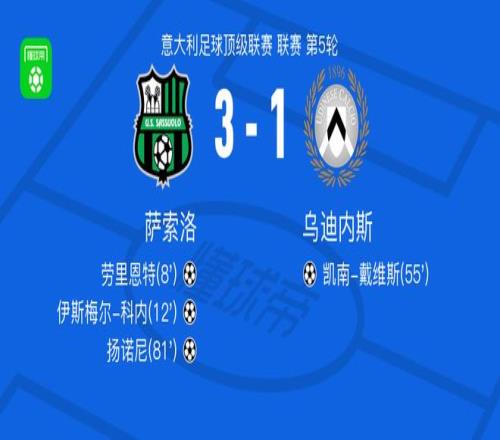 北京时间9月28日,意大利足球顶级联赛第5轮,萨索洛坐镇主场迎战乌迪内斯。比赛开始后,萨索洛迅速进入状态,贝拉尔迪送出精准传球,帮助劳里恩特率先破门。随后不久,劳里恩特在边路发动进攻,助攻伊斯梅尔-科内再下一城,扩大领先优势。易边再战,乌迪内斯由凯南-戴维斯抓住机会扳回一球,一度看到追分希望。然而萨索洛在比赛末段依然保持高压态势,法代拉送出关键助攻,扬诺尼冷静推射得手,锁定胜局。最终全场比分定格为萨索洛3-1乌迪内斯。