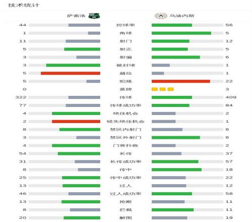 第8分钟,萨索洛球员贝拉尔迪助攻劳里恩特打入一球。 第12分钟,萨索洛球员劳里恩特助攻伊斯梅尔-科内打入一球。 第55分钟,乌迪内斯球员凯南-戴维斯打入一球。 第81分钟,萨索洛球员法代拉助攻扬诺尼打入一球。 球队阵容 技术统计 |