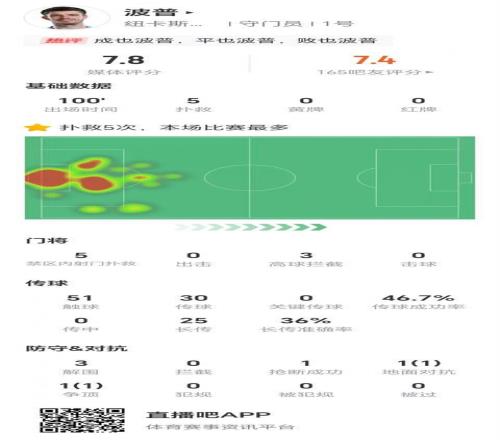 波普数据:全场5次扑救,3次高球拦截,3次解围,获评7.8分