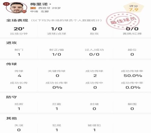 梅里诺全场数据:替补神兵天降助阿森纳扳平比分+1次抢断