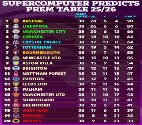 超级电脑预测阿森纳将逆袭红军夺冠,曼联排第15艰难保级