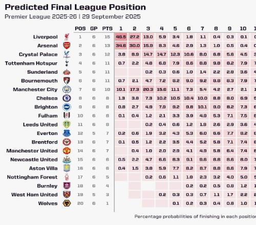 雷速体育9月29日宣 新赛季英超联赛进行到第6轮,国外数据机构使用超级计算机更新了对本赛季最终积分榜的预测,利物浦仍以46.5%的夺冠率位居第一。 本轮比赛,利物浦客场1-2被水晶宫绝杀,遭遇本赛季的第一场败仗,随后阿森纳则是在客场2-1绝杀了纽卡斯尔联,将他们与利物浦的积分差距缩小到2分。 在这样两场比赛过后,超级计算机将阿森纳的夺冠概率提升到了34.6%,但暂时还无法超越利物浦。 而在他们之后的排名中,曼城10.1%的夺冠概率为全联盟第3高,目前唯一保持不败的水晶宫也有着3.8%的夺冠概率,位列第四名。 再往后看,切尔西的夺冠概率目前为1.3%,热刺也有着0.7%的可能性,而曼联则是英超BIG6中唯一概率为零的队伍,同时计算机也并不看好他们的争四前景。 |