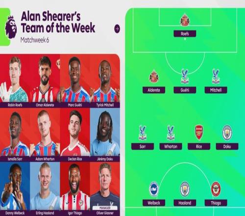 雷速体育9月30日宣 英超名宿阿兰·希勒为英超官方评选了第6轮比赛的最佳阵容。 帮助水晶宫战胜利物浦的中场球员亚当·沃顿得到希勒极高评价,格拉斯纳成为周最佳主帅,哈兰德、赖斯等人入选。 罗宾·罗埃夫斯(桑德兰): 力拒对手进球,6次扑救帮助桑德兰1-0取胜。 奥马尔·阿尔德雷特(桑德兰): 一记精彩的头球制胜,他在后防线上的表现也堪称坚如磐石。 格伊(水晶宫): 从第一分钟到最后一分钟都表现出色,甚至还送出了助攻,帮助水晶宫赢得比赛。难怪利物浦想要签下他! 泰里克·米切尔(水晶宫): 他让萨拉赫整场比赛都碌碌无为。 伊斯梅拉·萨尔(水晶宫): 伤愈复出,状态神勇!他各项表现都非常出色,多次精彩跑动,并首开纪录。 亚当·沃顿(水晶宫): 在与利物浦强大的三叉戟——麦卡利斯特、赫拉芬贝赫和索博斯洛伊——的对抗中,沃顿无疑是完胜。 赖斯(阿森纳): 他无处不在,先是回防雅各布·墨菲,用精彩的封堵阻止了他,然后又用一记精彩的传中为阿森纳扳平比分。 多库(曼城): 在曼城5-1大胜伯恩利的比赛中,他先是制造了首开纪录,随后又送出了助攻。 维尔贝克(布莱顿): 替补出场、梅开二度,帮助布莱顿赢得了比赛。即使已经34岁高龄,维尔贝克依然状态强劲。 哈兰德(曼城): 又进了两个球,还策动了一个进球,他冲击下一座金靴奖的路上似乎无人可以阻止。 伊戈尔·蒂亚戈(布伦特福德): 两粒精彩的进球重击了曼联。 格拉斯纳(水晶宫): 说他彻底改变了水晶宫都不足以称赞他。格拉斯纳的表现简直令人惊叹,他的球队完全配得上这场对阵卫冕冠军的精彩胜利。 |