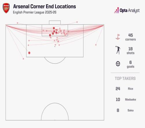 阿森纳前6轮拿45个角球英超最多,近三个赛季通过角球进36球