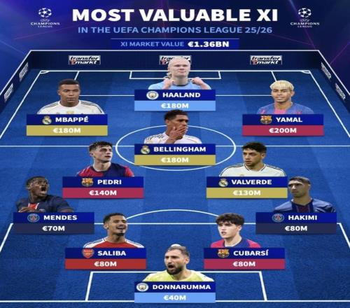 权威媒体发布欧冠身价最贵阵容:亚马尔姆巴佩!实力很一般