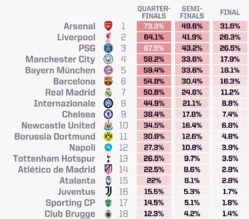 雷速体育10月2日宣 权威统计机构使用超级计算机进行计算后,认为阿森纳是本赛季欧冠的最大热门,利物浦、巴黎、曼城、拜仁、巴萨、皇马、国米、切尔西紧随其后。并给出了各大豪门进展到赛事各个阶段的预测概率,如下表所示。 超算预测欧冠冠军热门Top 10球队晋级16强概率八强概率四强概率决赛概率冠军概率阿森纳89.64%73.33%49.62%31.64%18.09%利物浦58.79%64.14%41.88%26.28%14.7%巴黎圣日耳曼79.87%67.53%43.24%26.54%13.96%曼城61.19%58.21%33.60%17.92%9.71%拜仁68.76%59.38%33.60%18.12%9.5%巴萨54.67%54.81%30.43%16.28%8.25%皇马62.36%50.82%24.62%11.24%4.94%国米54.25%44.88%21.15%8.81%3.73%切尔西37.13%38.36%17.81%7.36%3.51%纽卡斯尔38.96%34.53%16.35%6.85%3.13% |