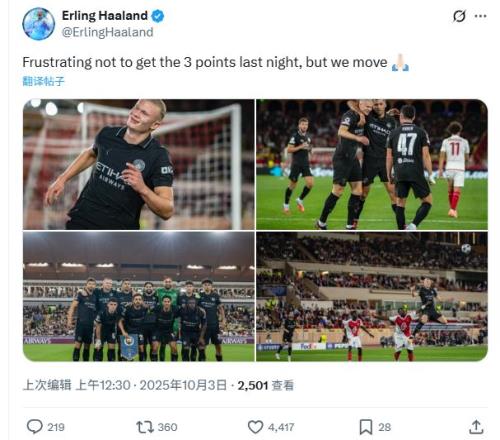 雷速体育10月3日宣 曼城在第二轮欧冠比赛中2-2战平摩纳哥,被对手90分钟点射绝平。哈兰德完成梅开二度难救主。 哈兰德更新社交媒体写道:“昨晚没能拿到三分很沮丧,但我们会继续前进。” 下轮英超比赛,曼城将在两天后客场对阵布伦特福德。 |