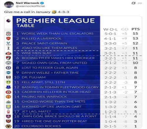 曼联现排名英超第14,新赛季前景不容乐观。在此背景下,76岁的传奇教练沃诺克在社媒平台上以一则幽默的帖子半开玩笑地毛遂自荐。 由于阿莫林在老特拉福德承受着巨大压力,他在俱乐部的未来正受到前所未有的质疑。而沃诺克在一条列出各队排名并附有双关语的帖子下做出了回应。(积分榜上曼联的名字被替换成了:“呼叫尼尔-沃诺克”。) 这位曾执教过20家不同俱乐部、以带领球队逃离降级威胁而闻名的老帅回复道:“一月份给我打电话吧!4-3-3。” 尼尔-沃诺克开玩笑说曼联应该联系他,并表示他会改变曼联的阵型。他对4-3-3阵型的提及,正是许多球迷和评论员用来批评阿莫林的“武器”之一。 沃诺克最初因在英冠联赛中的升级专家声誉而闻名,他曾带领谢菲联、QPR和卡迪夫城升入英超。在他的职业生涯后期,不少俱乐部也请他担任救火主帅。 【上咪咕独家看英超】 |