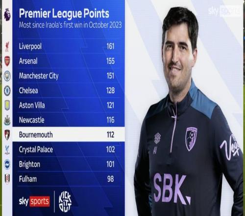 有能名帅!自23年10月以来,伯恩茅斯累计积分位列英超第7