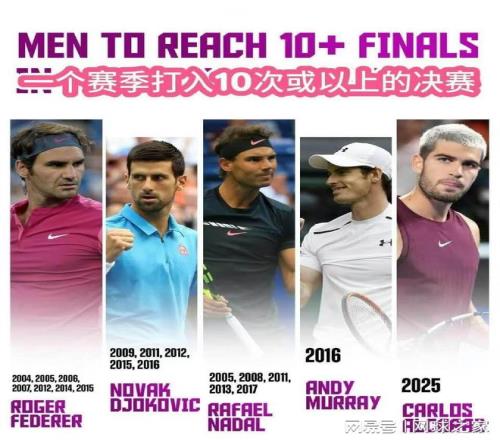 穆雷(1次) 穆雷之所以屡次被提及是第四巨头,皆因为其在巅峰自然年的表现非常惊艳,他在该年连续闯进大赛决赛,最终加冕年终和世界双料第一。 阿尔卡拉斯(1次,2025) 阿尔卡拉斯本赛季闯进10个决赛:鹿特丹、蒙卡、巴塞罗那、罗马、法网、女王杯、温网、辛辛那提、美网、东京。他仅在巴塞罗那(负鲁内)和温网(负辛纳)输球;而赢下的对手包括辛纳、穆塞蒂、弗里茨等一干猛将,可以说是出道以来的最强赛季。(来源:网球之家 作者:罗城七爷) |