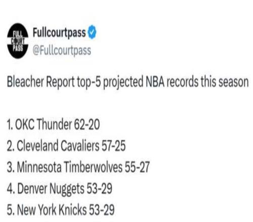 Bleacher Report预测战绩:62胜20负,联盟第一。