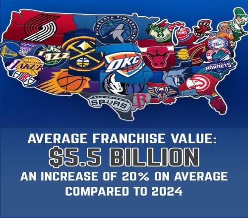 根据统计,联盟各队的平均估值为55亿美元,所有球队的总估值高达1650亿美元,和去年相比增长了20%,以下是具体排名: