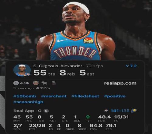 | 揭幕战,雷霆双加时125-124险胜火箭,亚历山大投篮26中12,罚球14中10,贡献35分5板5助; 次战,雷霆双加时141-135击败步行者。亚历山大投篮31中15,罚球26中23,狂轰55分8板5助。 两场比赛下来,亚历山大就成为了本赛季首个50+分先生,合砍90分之多。