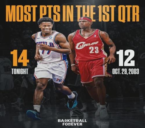 首节比赛,埃奇库姆就已经创造了一项历史纪录。 首发出战的他在比赛前5分钟没有运动战进球,仅靠罚球得到1分,但从6分22秒他杀到篮下完成双手暴扣开始,得分的阀门就再也止不住了。 随后的半节他命中3记三分加一记上篮,首节砍下14分,打破了由勒布朗-詹姆斯保持了22年之久的生涯首秀单节得分纪录(12分)。 埃奇库姆的疯狂表演还在持续,得分源源不断,虽然有最后时刻两罚不中的尴尬,却丝毫不影响这场历史级别首秀表演的伟大。 最终,埃奇库姆全场砍下34分,打破了阿伦-艾弗森保持的76人队史生涯首秀得分纪录(30分)。 生涯首秀34分放眼也是历史第三高,仅次于1954年弗兰克-塞尔维的35分和1959年威尔特-张伯伦的43分。